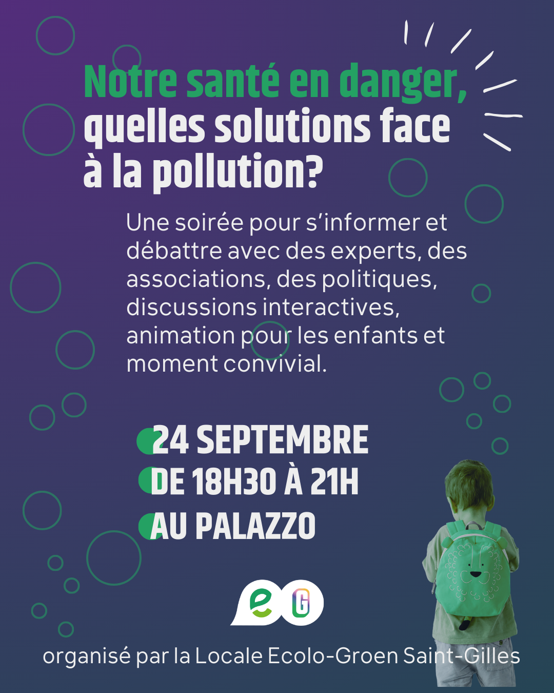 Notre santé en danger – quelles solutions face à la pollution ? Une soirée pour s’informer et débattre, organisée par Ecolo-Groen Saint-Gilles ⚠️ Les différentes pollutions ont un impact majeur sur notre santé, en particulier pour les enfants et les quartiers populaires. Des progrès ont été réalisés ces dernières années : amélioration de la …